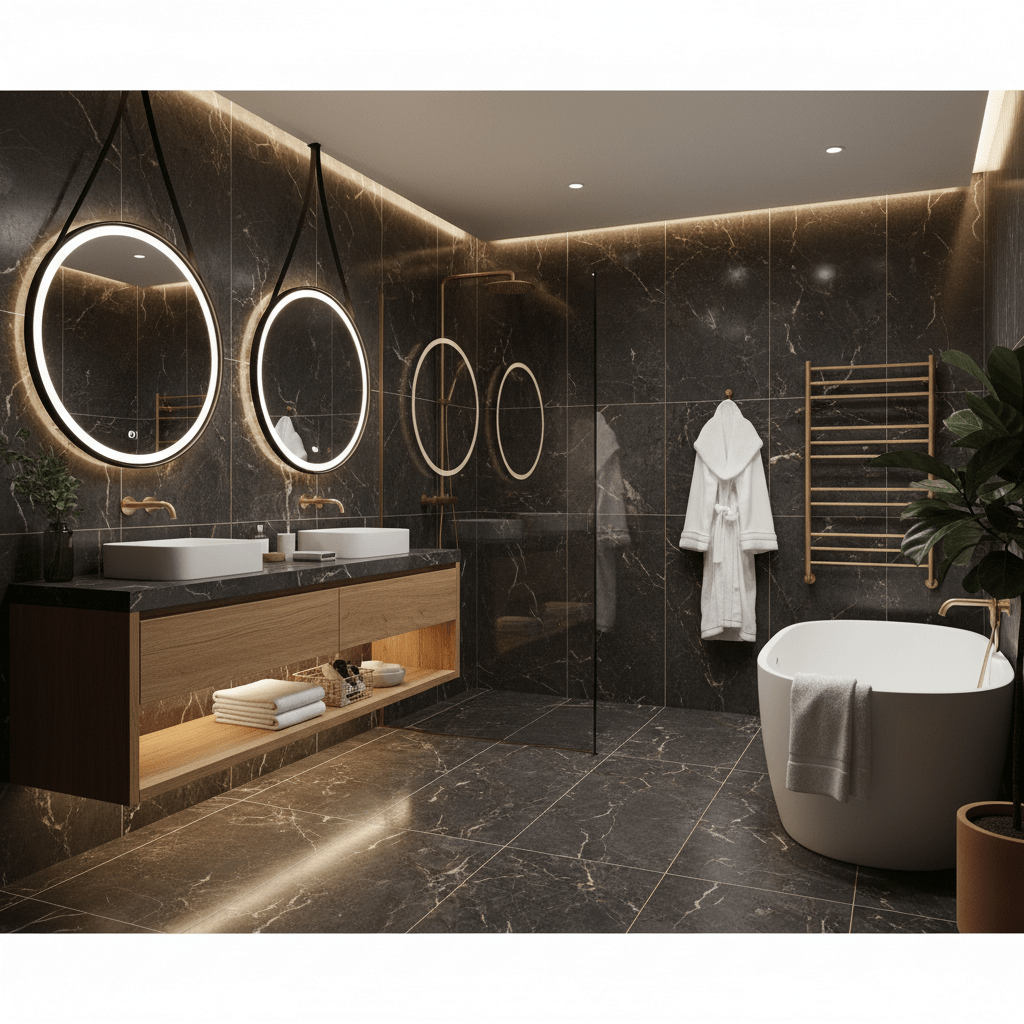 Houtlooks, matte betonciré-afwerkingen en natuursteenstructuren zijn populairder dan ooit. Ze geven de badkamer visuele diepte en een gevoel van kwaliteit dat glanzende tegels minder snel geven.
